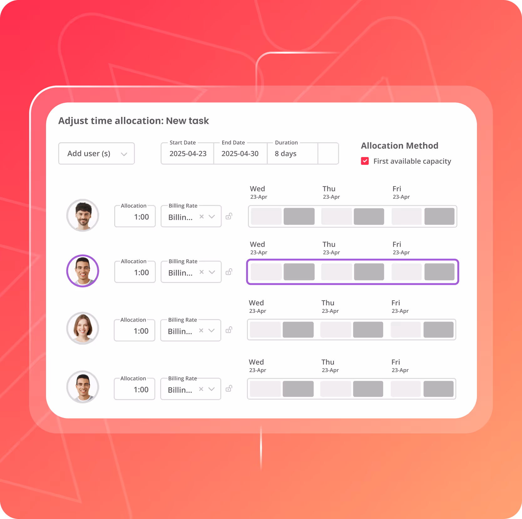 Get a real-time view of how your team’s time is divided across projects and who’s available for upcoming work, so you can optimise assignments, plan ahead, and prevent overload before it happens.