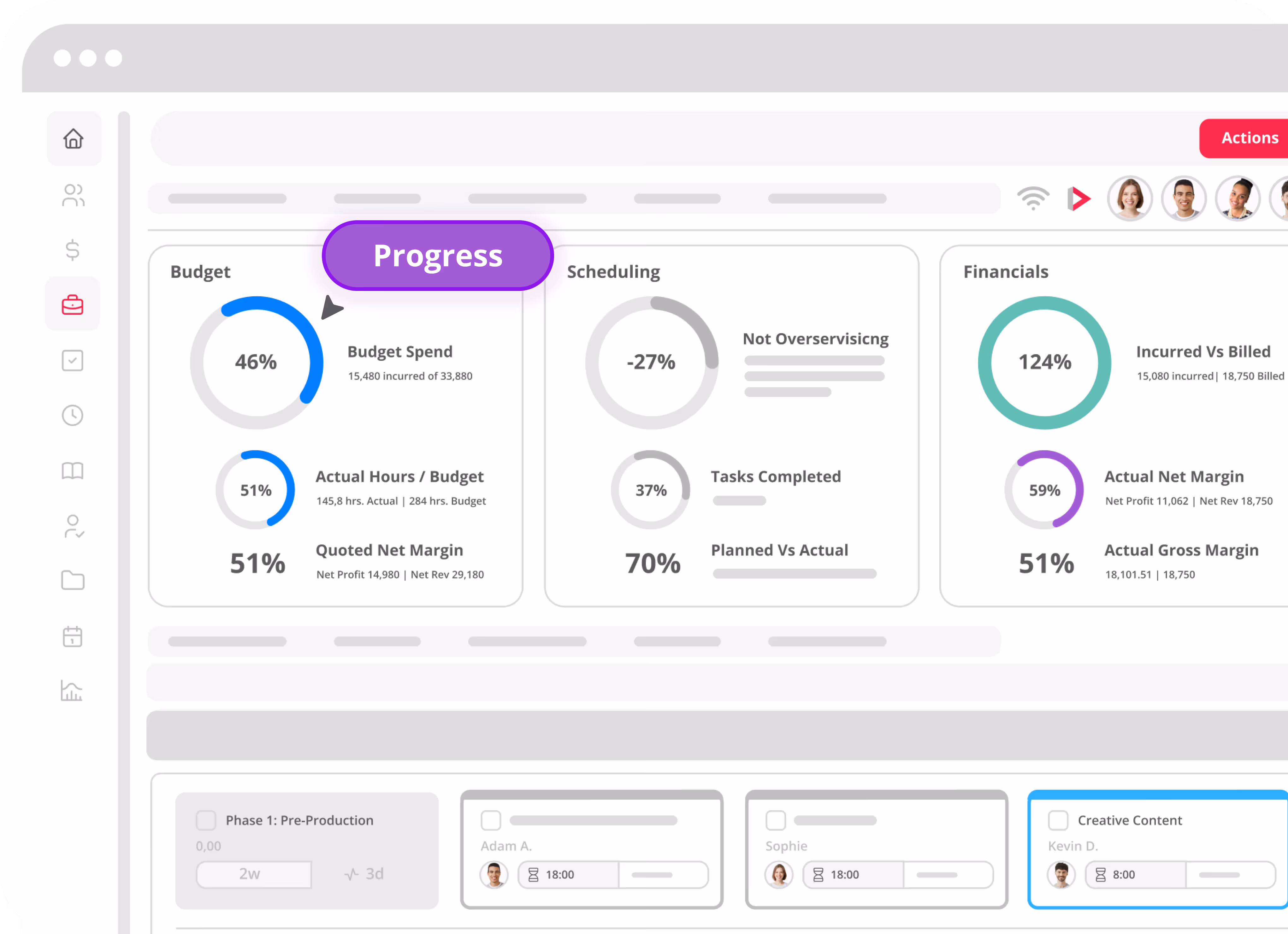 Track every project’s timeline, budget, and scope in real time, and manage progress, blockers, and clients in one place.