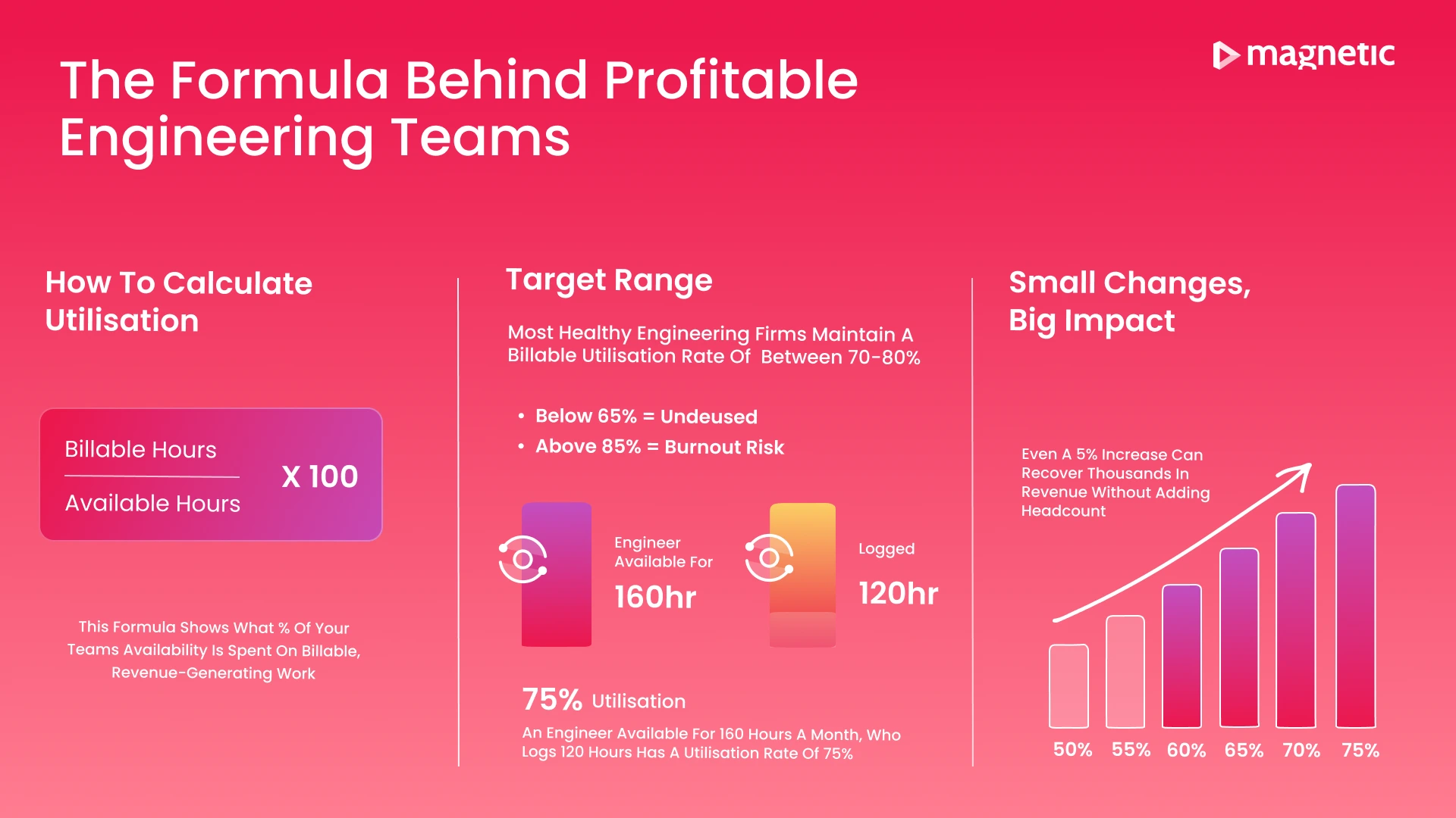 Too low and valuable hours slip away unbilled. Too high and you push your engineers to the point where mistakes creep in, quality drops, and good people start looking for the exit.