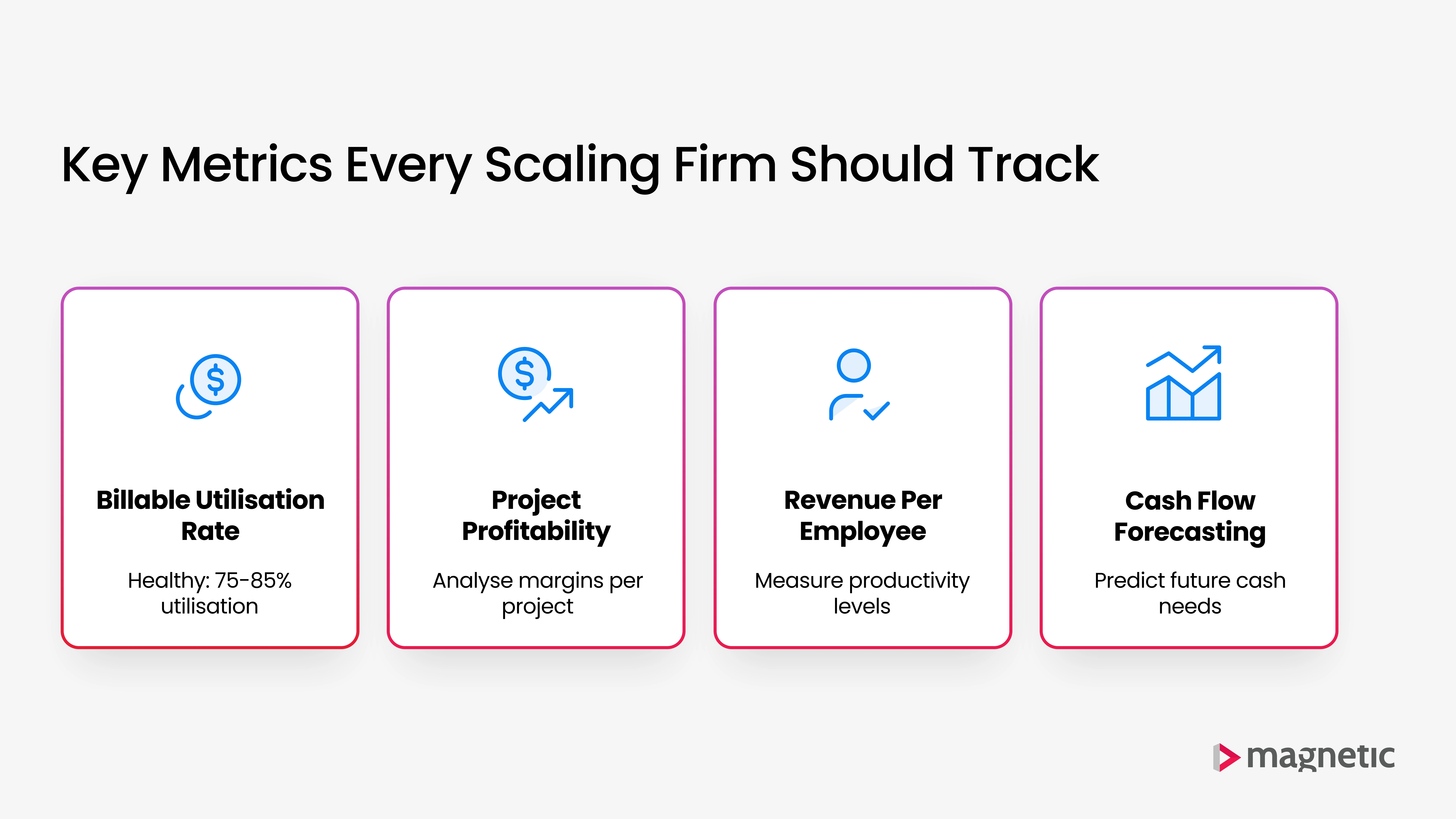 Billable utilisation rate, project profitability, revenue per employee, and cash flow forecasting are key. These metrics show whether your growth is sustainable and where to make adjustments.
