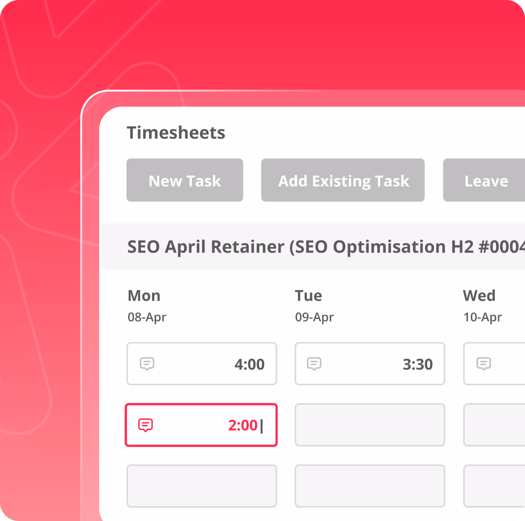 Make time tracking easier for ongoing work. Quickly allocate hours across multiple days and keep your timesheets clean, complete, and hassle-free.